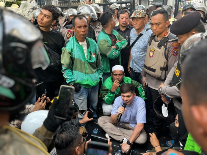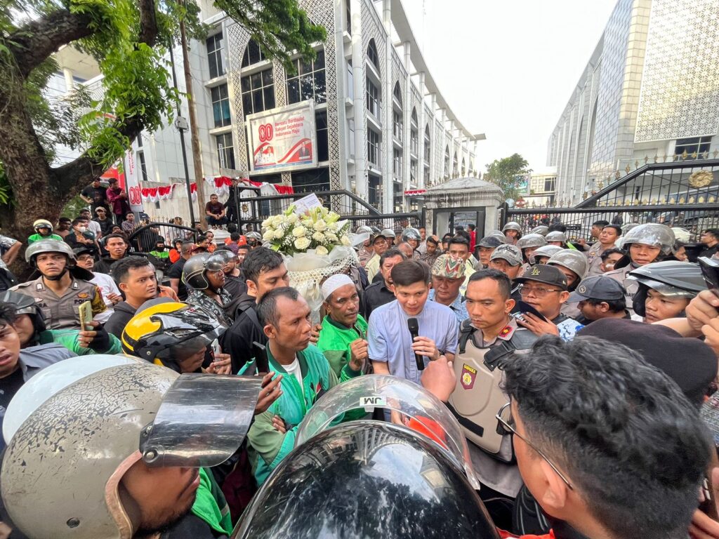 Medan | GeberNews.com – Anggota DPRD Provinsi Sumatera Utara dari Fraksi Partai Amanat Nasional, M. Faisal, turun langsung menemui massa aksi pengemudi ojek online yang berunjuk rasa di depan Gedung DPRD Sumut, Jumat 29 Agustus 2025. Aksi tersebut digelar sebagai bentuk solidaritas sekaligus tuntutan keadilan atas insiden tragis di Jakarta, ketika seorang driver ojol dilaporkan menjadi korban penabrakan kendaraan taktis milik Brimob saat pengamanan aksi.