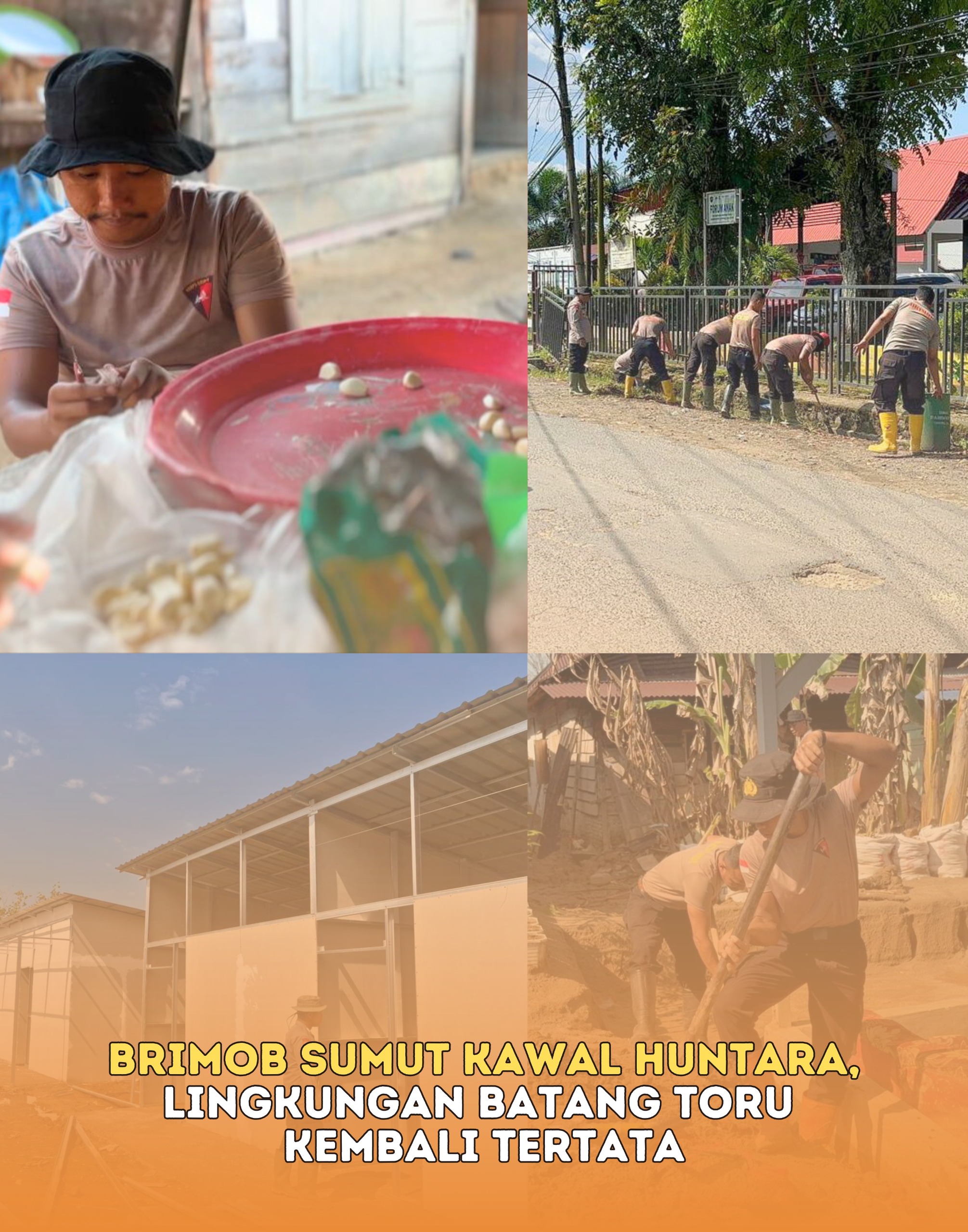 Kegiatan yang dipimpin oleh Danki 1 Penugasan AKP Antanius Tarigan, S.H., M.H., tersebut meliputi patroli pengamanan di sekitar pembangunan rumah hunian sementara (Huntara) Posko Brimob Hapesong Lama, Desa Simatuhir, pembersihan lingkungan Kantor Camat Batang Toru, operasional dapur lapangan, pengecatan Huntara di Desa Garoga, hingga pembuatan parit di samping rumah warga.