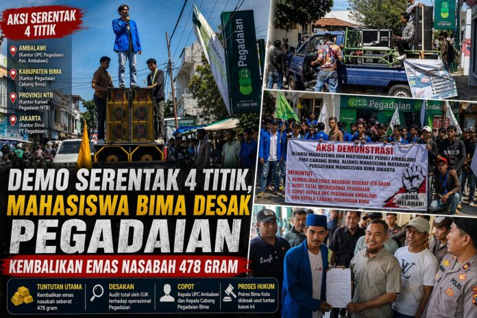 GeberNews.com | Bima – Gelombang protes mengguncang Pegadaian. Empat organisasi kepemudaan (OKP), termasuk PMII Cabang Bima, menggelar aksi demonstrasi serentak di sejumlah titik, menuntut pengembalian emas nasabah yang diduga bermasalah.
