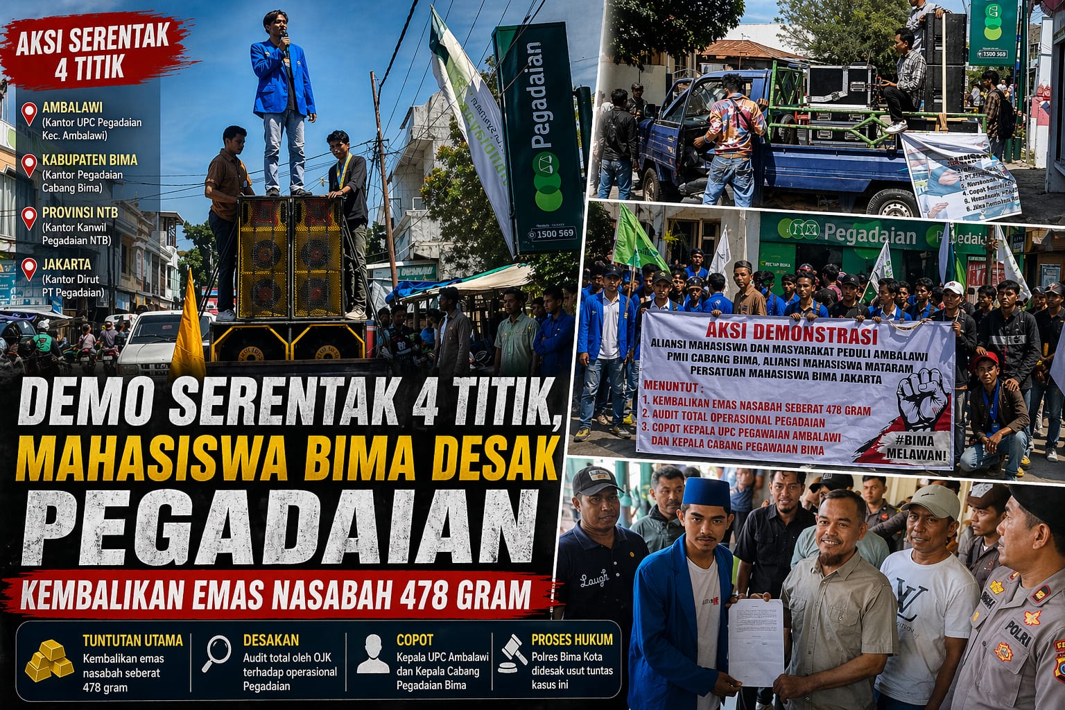 Dalam orasinya, massa menyampaikan sejumlah tuntutan tegas. Mereka mendesak Pegadaian segera mengembalikan emas seberat 478 gram milik nasabah. Selain itu, mereka juga menyoroti dugaan praktik gadai ilegal di wilayah Bima.