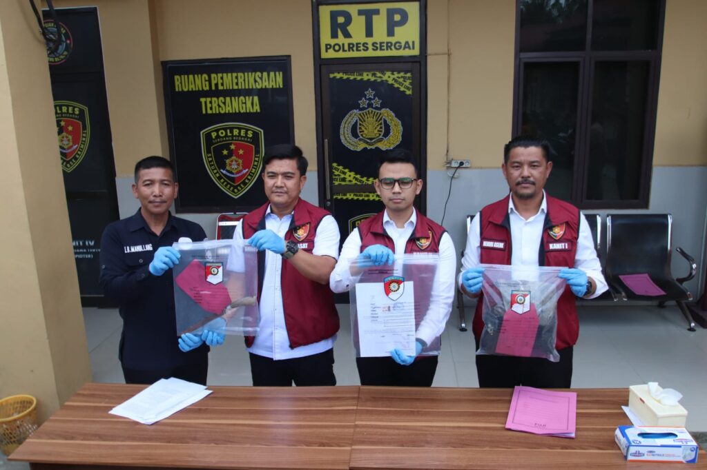 Tersangka langsung diboyong ke Sat Reskrim Polres Sergai untuk pemeriksaan intensif. Dalam interogasi, ia mengakui perbuatannya menikam korban menggunakan pisau belati bergagang kayu sepanjang kurang lebih 30 cm.