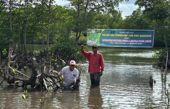 Medan | GeberNews.com – Bobylovers Sumatera Utara kembali menegaskan komitmennya dalam menjaga kelestarian lingkungan dengan menggelar aksi penanaman seribu bibit mangrove di Desa Lubuk Kertang, Kecamatan Brandan Barat, Kabupaten Langkat, Minggu, 21 Desember 2025. Kegiatan ini menjadi bagian dari langkah nyata rehabilitasi kawasan pesisir yang terdampak abrasi dan degradasi ekosistem.