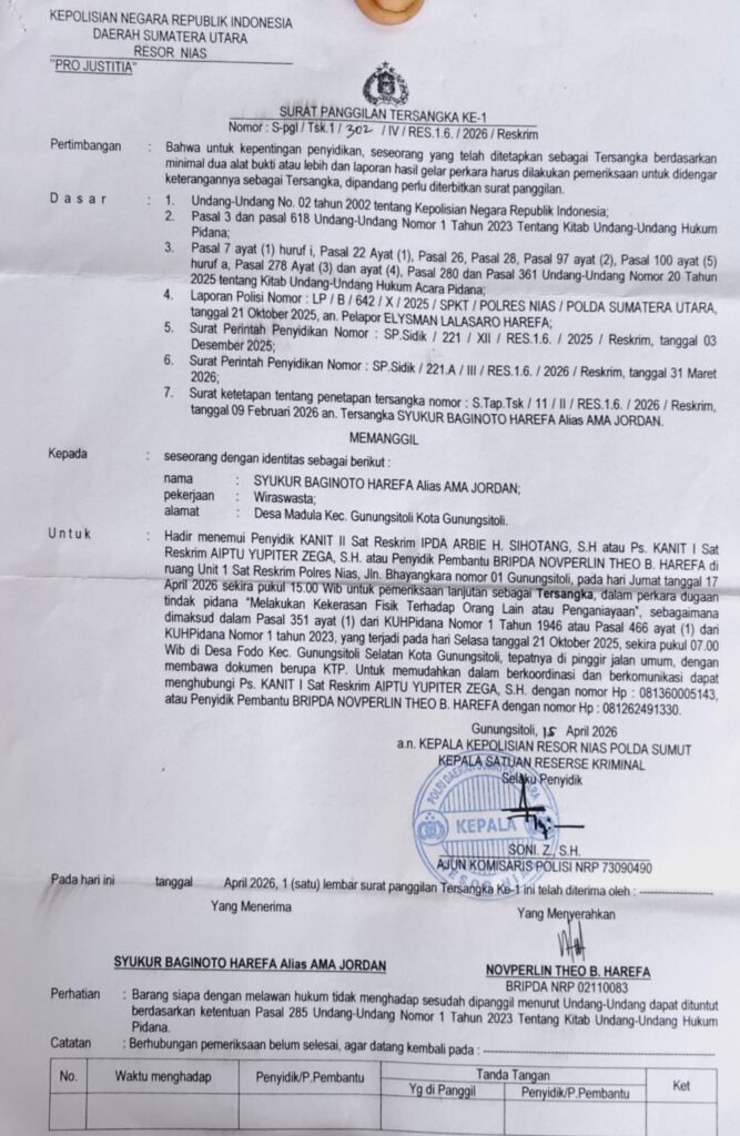 Sebaliknya, laporan yang diajukan Elysman Lalasaro Harefa justru berlanjut hingga tahap penyidikan. Bahkan, Syukur Baginoto Harefa telah ditetapkan sebagai tersangka dalam perkara tersebut.