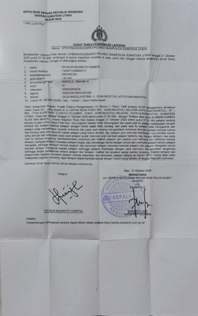 GeberNews.com | Gunungsitoli — Penanganan kasus saling lapor dugaan penganiayaan di Kabupaten Nias, Sumatera Utara, menuai sorotan publik. Perbedaan signifikan dalam proses hukum terhadap dua pihak yang terlibat memunculkan pertanyaan terkait konsistensi dan objektivitas aparat penegak hukum.