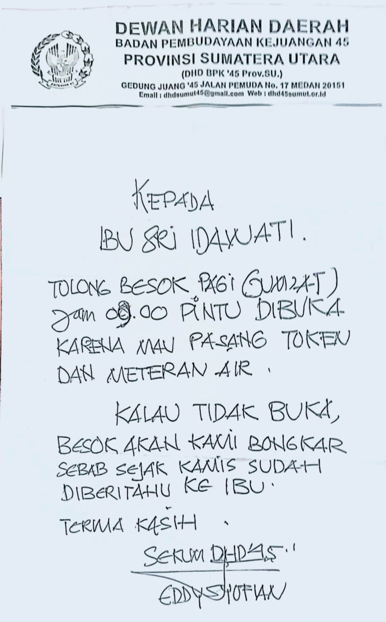 Ia juga menyampaikan bahwa sehari sebelum kejadian, dirinya menerima surat ancaman pembongkaran dari Dewan Harian Daerah (DHD) Museum Gedung Juang 45. Surat beramplop resmi itu ditulis tangan dan ditandatangani oleh Edy Sofyan, Sekretaris Umum DHD Museum Gedung Juang 45.