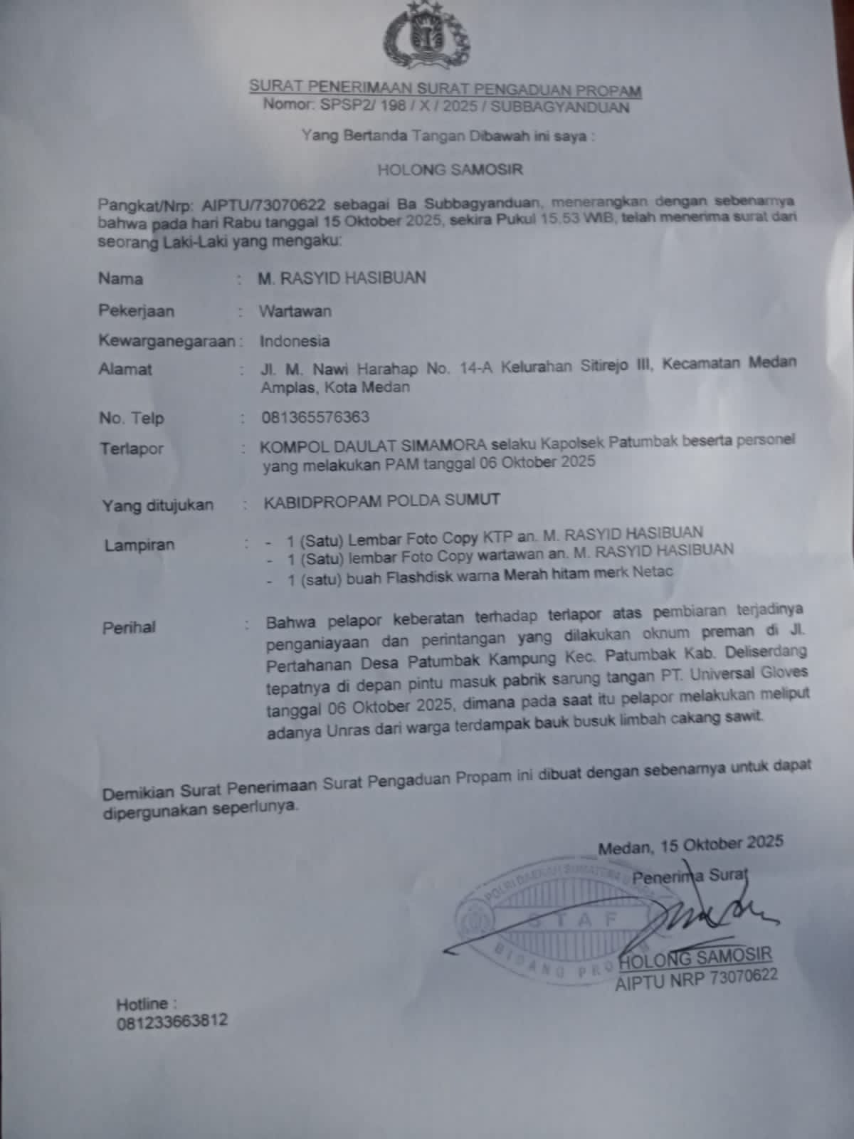 Medan I GeberNews.com-Pasca Aksi demo Solidaritas Jurnalis Sumut Trituwa, massa aksi yang diwakili M Rasyid Hasibuan resmi melaporkan Kapolsek Patumbak dengan kasus dugaan pembiaran terjadinya penganiayaan dan intimidasi yang diduga dilakukan oleh para preman di depan pintu masuk PT Universal Gloves terhadap wartawan, Rabu (15/10/2025).