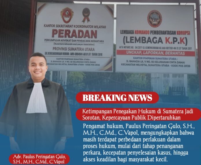GeberNews.com | Medan – Ketimpangan penegakan hukum di berbagai wilayah Sumatera Utara kembali menjadi perhatian serius publik. Praktik hukum yang dinilai belum sepenuhnya adil dan merata memicu kekhawatiran akan terus merosotnya kepercayaan masyarakat terhadap sistem peradilan.