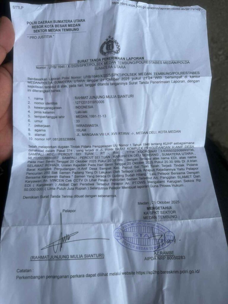 Sementara itu Kapolsek Medan Tembung Polrestabes Medan Kompol Ras Maju Tarigan membenarkan telah menerima 2 orang terduga pelaku tindak pidana pencurian dengan pemberatan berikut barang bukti puluhan sak semen serta 1 (satu) unit mobil pick up, yang diserahkan langsung dari kuasa hukum perusahaan. Dengan STPL Nomor : LP / B / 1664 / X / 2025 / SPKT / POLSEK MEDAN TEMBUNG/ POLRESTABES MEDAN / POLDA SUMATERA UTARA atas nama Rahmat Junjung Mulai Sianturi.