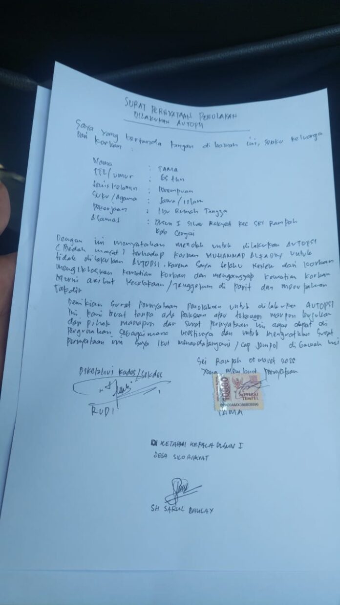 Kasi Humas Polres Sergai, Iptu Zulfan Ahmadi, mengatakan bahwa pihak kepolisian sempat berencana melakukan autopsi, namun keluarga korban menolak dan menganggap kejadian ini sebagai musibah.