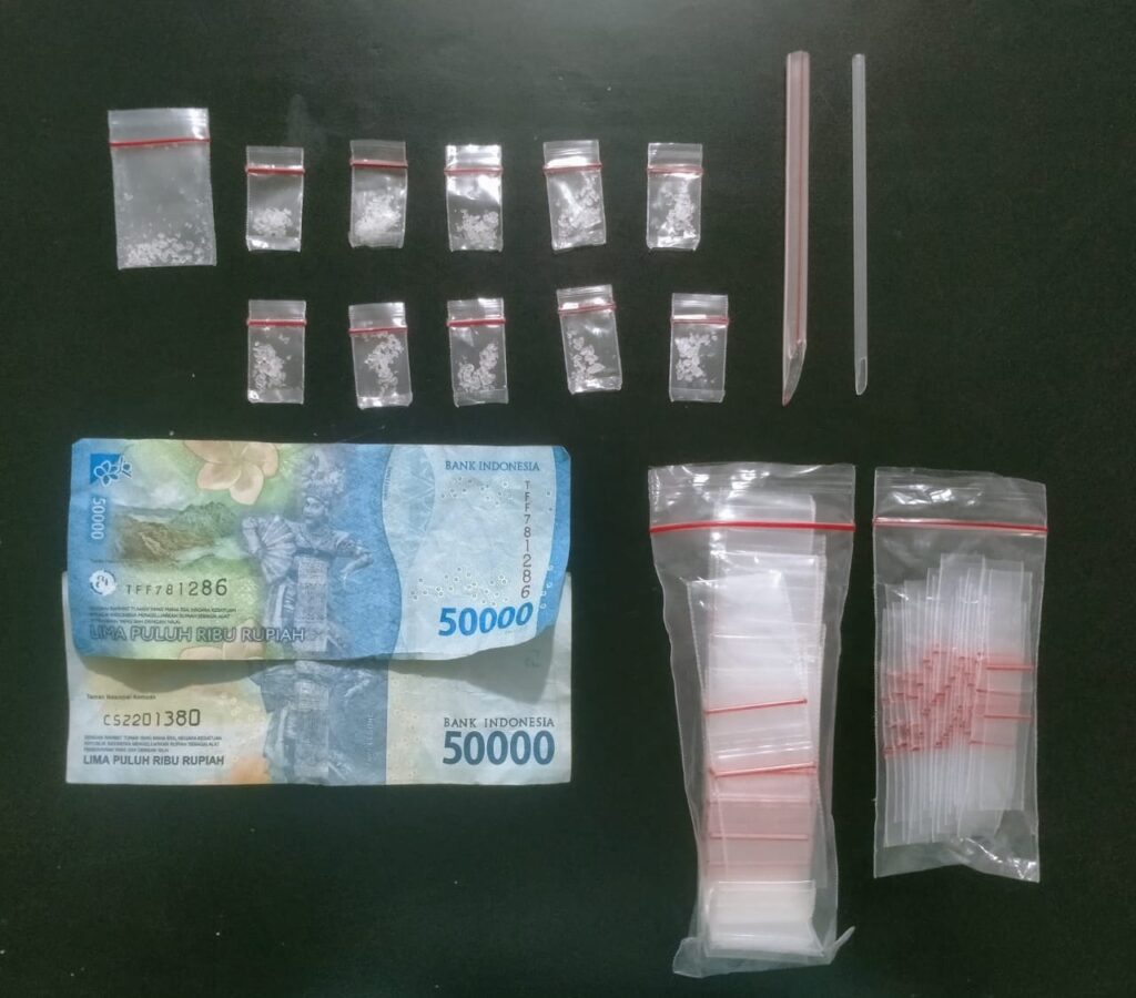 Dari tangan pelaku, petugas mengamankan barang bukti berupa uang tunai Rp100.000, 11 plastik klip transparan berisi butiran kristal diduga sabu, dua buah skop yang terbuat dari pipet, serta dua bungkus plastik klip transparan kosong.