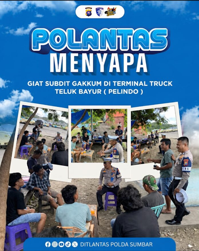 GeberNews.com | Padang – Suasana di kawasan Terminal Truck Teluk Bayur, Pelindo, tampak berbeda dari biasanya. Di tengah aktivitas logistik yang padat, jajaran Subdit Gakkum Ditlantas Polda Sumatera Barat menggelar kegiatan bertajuk “Polantas Menyapa” yang berlangsung hangat dan penuh keakraban.