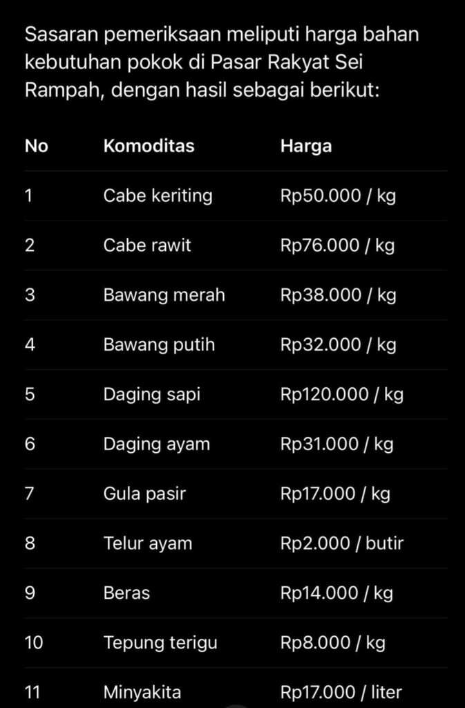 Sementara itu, Kanit Ekonomi Sat Reskrim Polres Serdang Bedagai, IPDA Ibnu Irsyady, S.Tr.K., memaparkan hasil pantauan harga sejumlah kebutuhan pokok di Pasar Rakyat Sei Rampah. Harga beras tercatat Rp 14.000 per kilogram, cabai rawit Rp 76.000 per kilogram, cabai keriting Rp 50.000 per kilogram, bawang merah Rp 38.000 per kilogram, bawang putih Rp 32.000 per kilogram, telur ayam Rp 2.000 per butir, minyak goreng merek Minyakita Rp 17.000 per liter, gula pasir Rp 17.000 per kilogram, daging sapi Rp 120.000 per kilogram, daging ayam Rp 31.000 per kilogram, serta tepung terigu Rp 8.000 per kilogram.