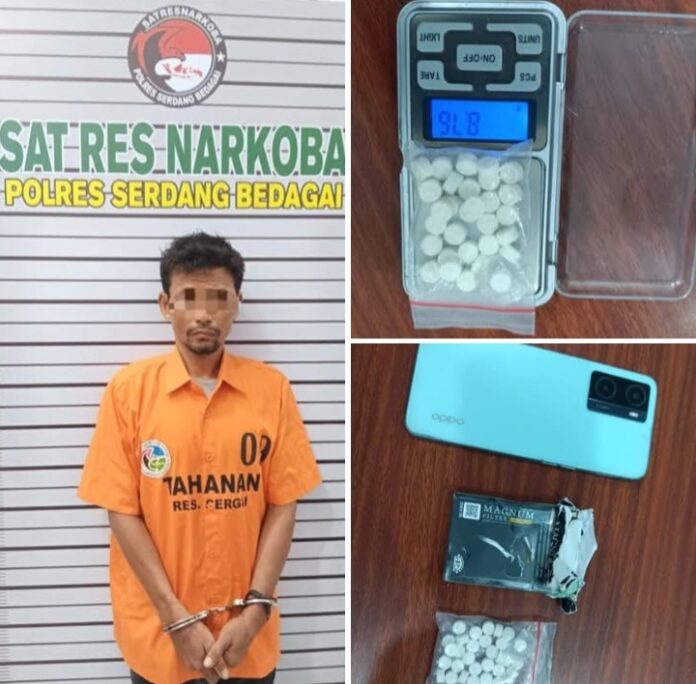 Tersangka, Dedi Iskandar Hutajulu (38), warga Jalan Pala Pajak Rabu, Kelurahan Sei Mencirim, Kecamatan Medan Sunggal, Kota Medan, ditangkap dengan barang bukti 31 butir pil ekstasi merek Mercy seberat 8,76 gram, satu unit ponsel merek OPPO, dan satu kotak hitam merek Magnum.