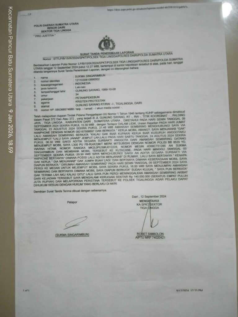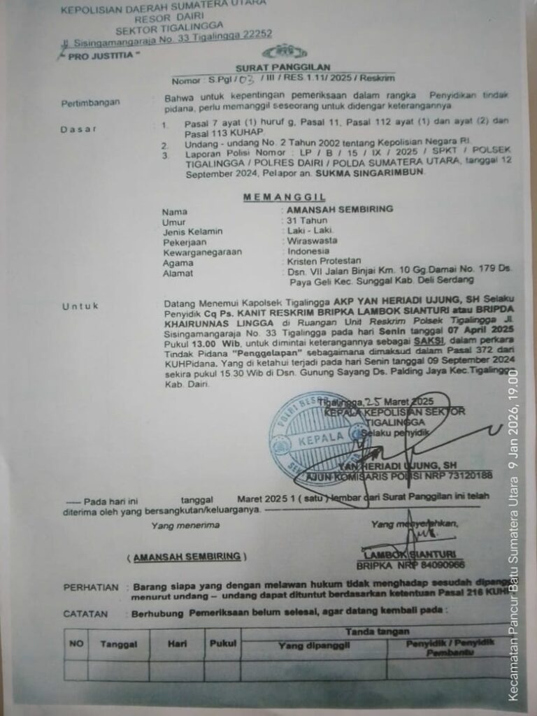 Tigalingga | GeberNews.com — Diduga penegakan hukum di wilayah Tigalingga, Kabupaten Dairi, berada dalam kondisi memprihatinkan. Sudah lebih dari satu tahun tiga bulan, laporan dugaan penggelapan yang dialami Sukma Singarimbun, warga Desa Gunung Sayang, tak kunjung menemukan kepastian hukum. Ironisnya, meski tersangka telah resmi ditetapkan, aparat kepolisian hingga kini diduga belum menunjukkan keberanian untuk melakukan penangkapan. Diduga, tersangka Arman alias Sah masih bebas berkeliaran tanpa status penahanan.