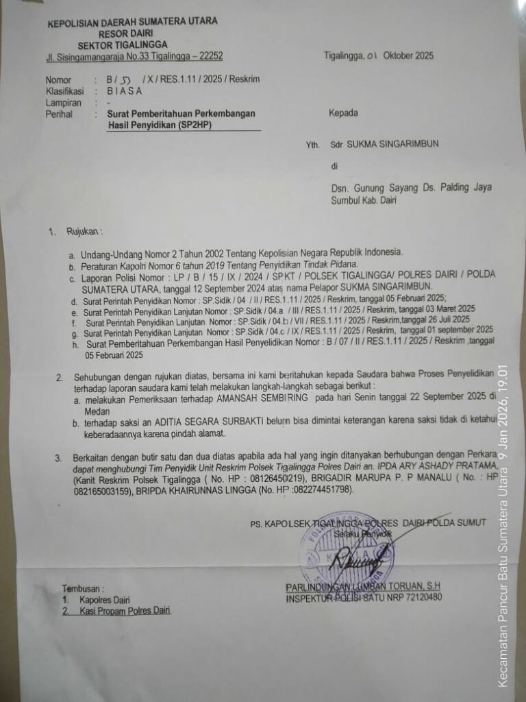 Diduga, Sukma mendesak Kapolda Sumatera Utara untuk turun langsung mengevaluasi kinerja Kapolsek Tigalingga IPTU Parlindungan Lumbantoruan, S.H., serta Kanit Reskrim IPDA Ary Ashady Pratama. Jika terbukti terjadi pembiaran atau keberpihakan terhadap tersangka, maka hal itu dinilai sebagai pengkhianatan terhadap hukum dan institusi Polri.