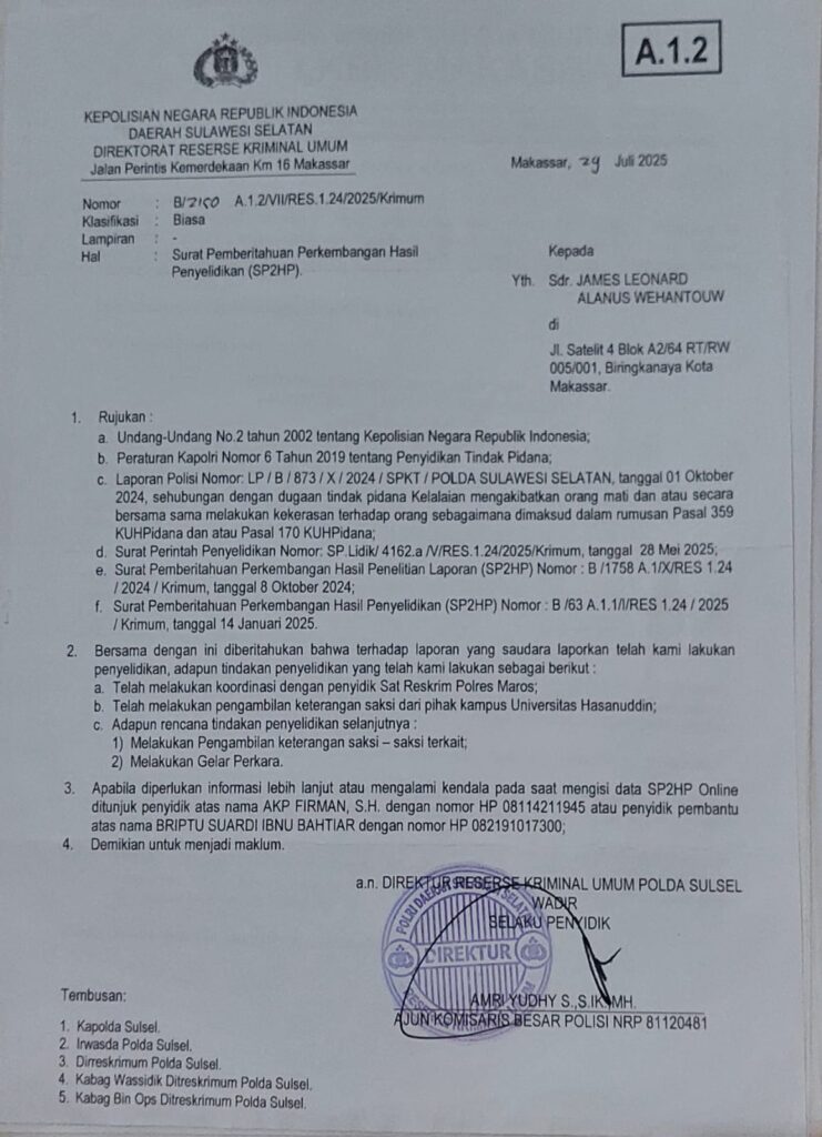 Dalam dokumen SP2HP tertanggal 29 Juli 2025 yang diteken Wadir Reskrimum Polda Sulsel AKBP Amri Yudhy S, disebutkan bahwa kepolisian telah berkoordinasi dengan Polres Maros serta memeriksa saksi dari Unhas. Rencana selanjutnya adalah gelar perkara, namun hal itu tak kunjung terealisasi.