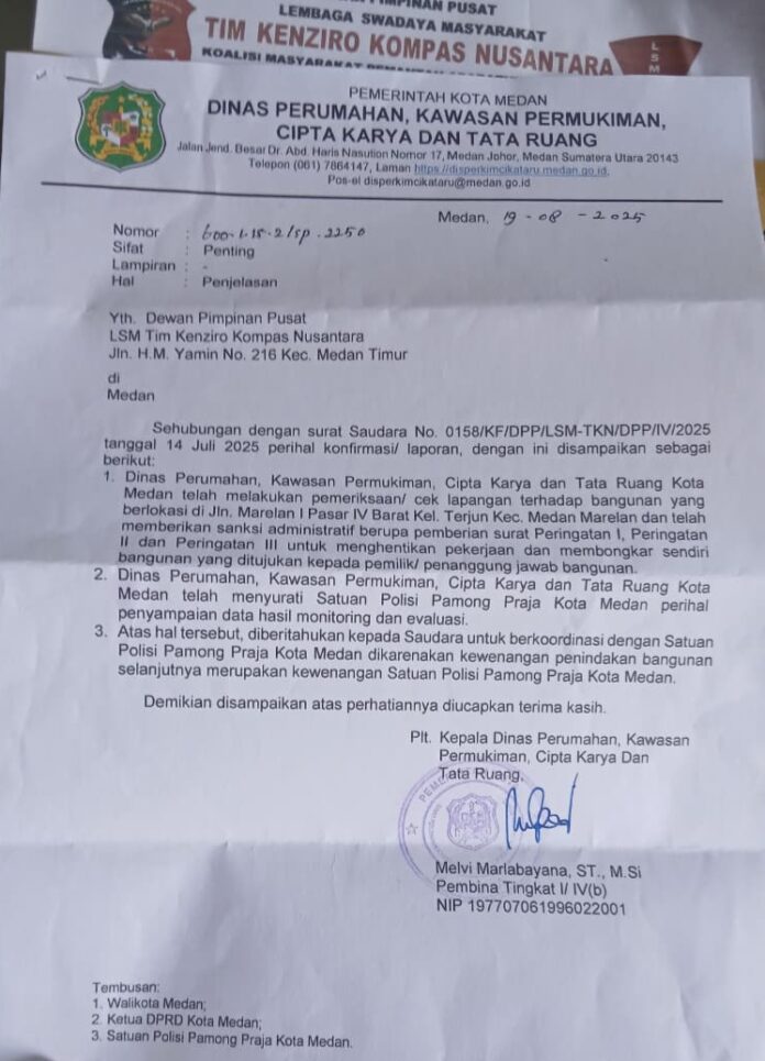 Medan | GeberNews.com – Ketua Umum DPP TKN Kompas Nusantara, Adi Warman Lubis, mendesak Satpol PP Medan untuk segera menindak tegas pembangunan liar yang terus berlangsung di Komplek Marelan Asri Residence, Pasar Empat Barat. Pembangunan yang sudah mencapai hampir 95 persen tersebut, diketahui tidak memenuhi syarat administratif, seperti PBG dan Amdal, meskipun sudah mendapat tiga kali teguran dari Dinas Perkim Medan.