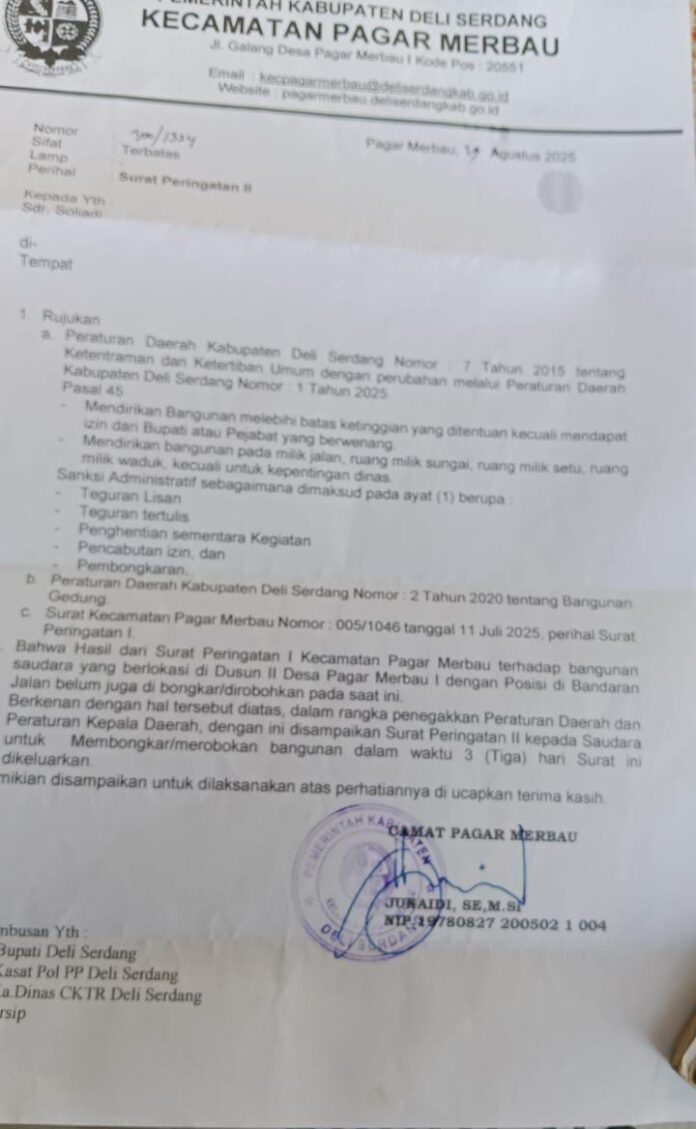 Camat Pagar Merbau sebelumnya telah mengeluarkan SP I dan SP II sebagai bentuk peringatan administratif. Namun hingga kini, belum terlihat langkah konkret menuju penerbitan SP3 maupun tindakan penertiban.