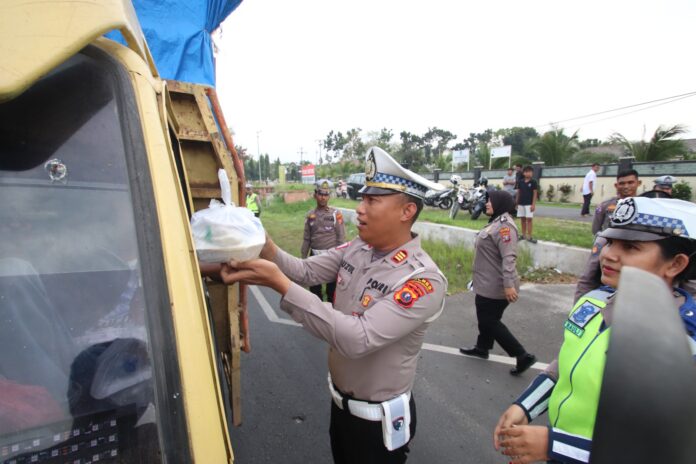 Sebelum pembagian dimulai, personel Satlantas lebih dahulu melakukan pengaturan arus lalu lintas guna memastikan situasi tetap aman dan terkendali.