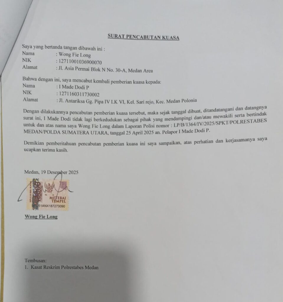Medan | GeberNews.com – Wong Felung cabut kuasa pengurusan laporan polisi terkait kasus sewa scaffolding yang menyeret dua perusahaan, dan memastikan penanganan perkara kini diambil alih langsung oleh kuasa hukum keluarga. Langkah tegas ini menandai babak baru dalam proses hukum yang sebelumnya dikuasakan kepada I Made Dodi P, namun dinilai tidak lagi efektif akibat selisih paham yang berulang.
