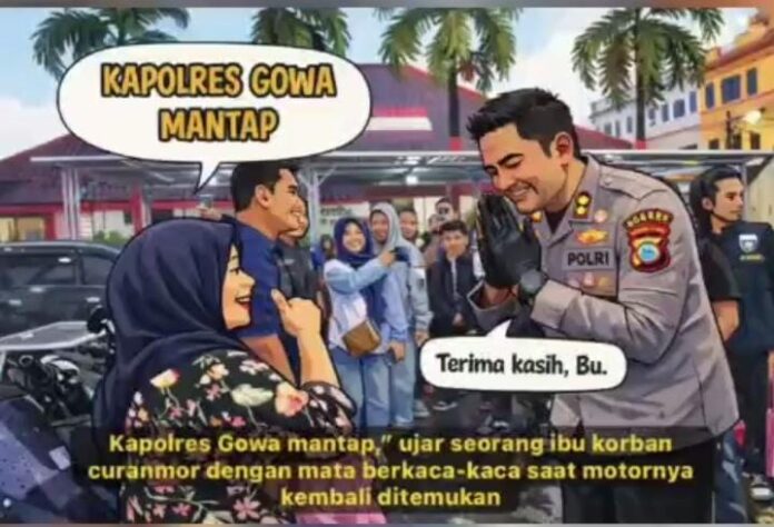 Gowa | GeberNews.com – Suasana haru bercampur tawa mewarnai halaman Mapolres Gowa saat sebuah sepeda motor yang sempat hilang akhirnya kembali ke tangan pemiliknya. Seorang ibu korban pencurian kendaraan bermotor (curanmor) tak kuasa menahan rasa syukur hingga spontan melontarkan pujian, “Kapolres Gowa mantap!” (24/02/2026).